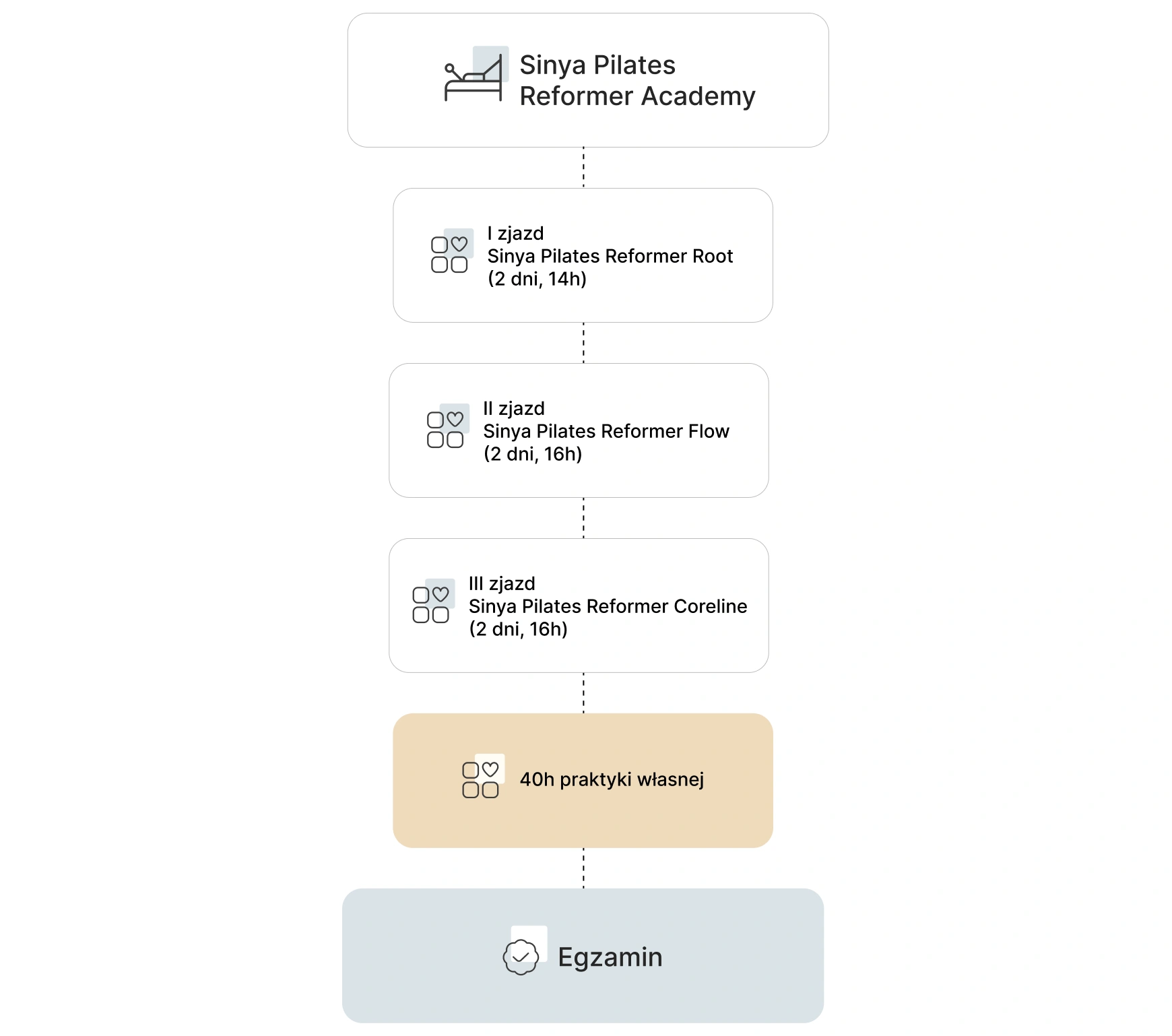 - Aby uzyskać tytuł Instruktora Pilates na reformerach (Sinya Pilates Reformer Instructor) należy zrealizować 3 zjazdy/szkolenia: Sinya Pilates Reformer Root, Sinya Pilates Reformer Flow oraz Sinya Pilates Reformer Coreline, zrealizować 40h praktyk oraz podejść do egzaminów teoretycznych i praktycznych.