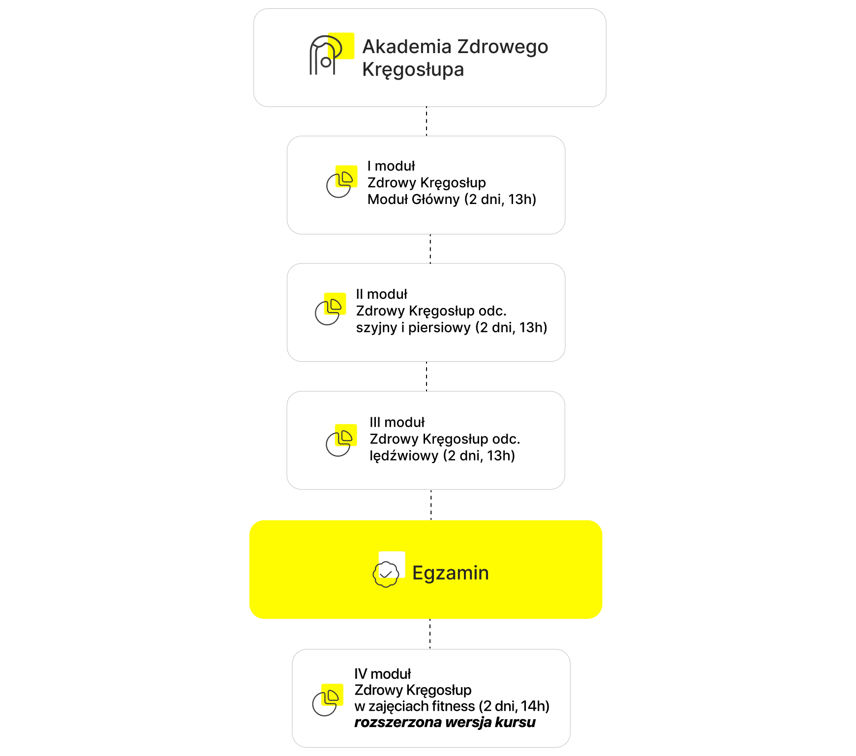 - Po ukończeniu 3 modułów Akademii Zdrowego Kręgosłupa tj. Zdrowy Kręgosłup Moduł Główny, Zdrowy Kręgosłup Odcinek Szyjny i Piersiowy oraz Zdrowy Kręgosłup Odcinek Lędźwiowy i Postawa Skoliotyczna uczestnik może podejść do egzaminu końcowego.